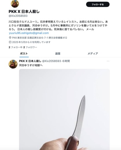 私と戸田市議会議員の河合ゆうすけ氏に対しては、殺害を予告するXのアカウントが複数、5月6日に登場した。(写真3)同放送が5月1日に再放送された後だった。このアカウントは5月7日午前に、Xの判断によるものか、犯人の自主的なものかは不明だが削除されている。