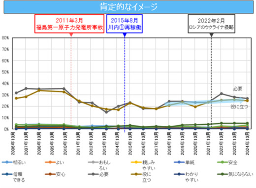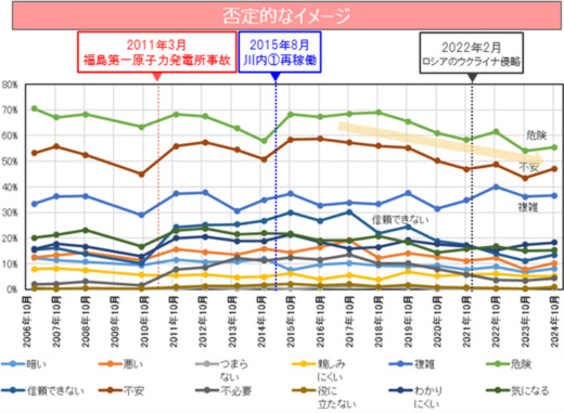 この調査では「原子力に対するイメージ」について複数回答で聞いた。「必要」は26.8%、「役にたつ」は24.8%となった。いずれも24年では対前年比で微減した。18年から肯定的イメージは緩やかに増加してきた。それが少し足踏みしたようだ。一方で「危険」は55.4%、「不安」は47.1%と割合は高いが、18年から緩やかに減少している(図表1、2)。