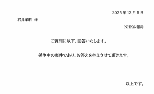 この問題で、雑誌寄稿をするため、NHKにコメントと、担当ディレクターの青山浩平氏への取材を申し込んだ。すると、以下の返事が12月5日に返ってきた。「係争中の案件であり、お答えを控えさせて頂きます」という。予想されたこととはいえ、あまりにも醜い対応であろう。彼らは責任を追及されることなく、デマを垂れ流している。